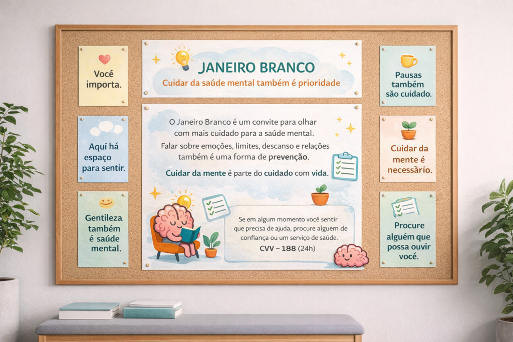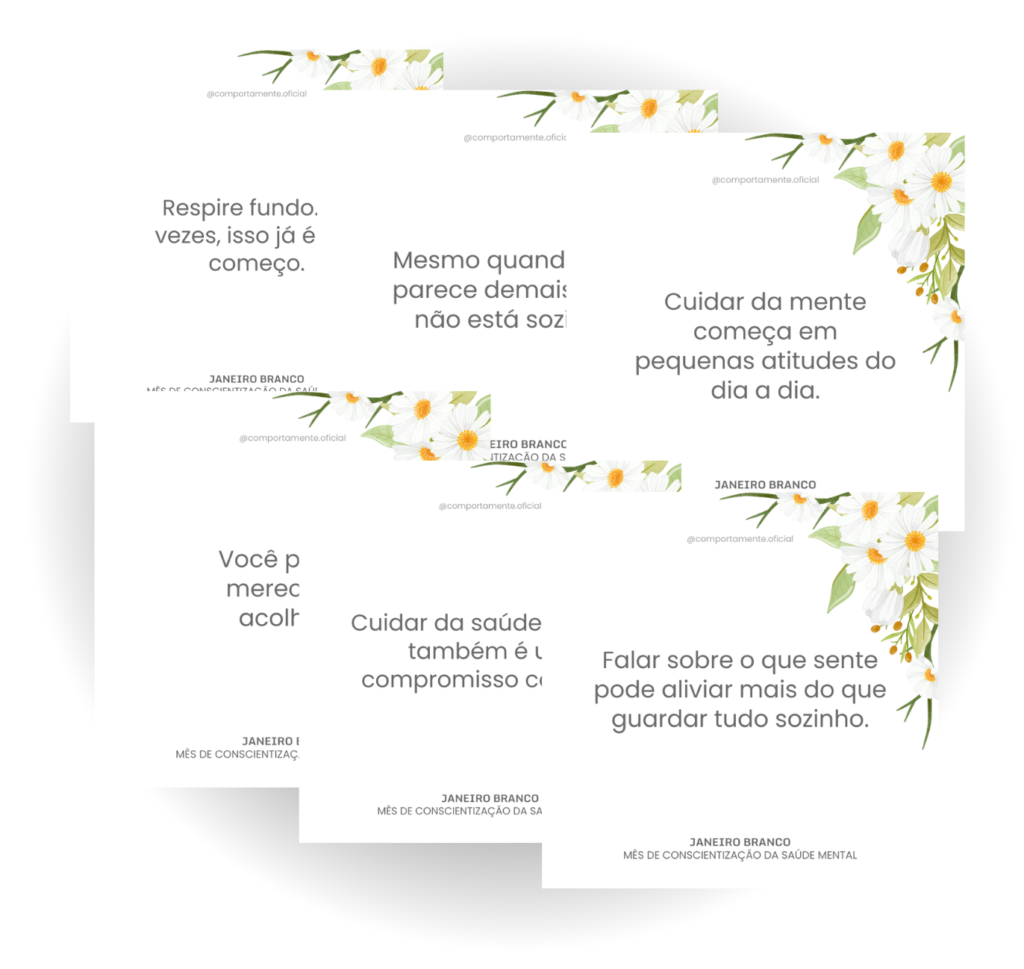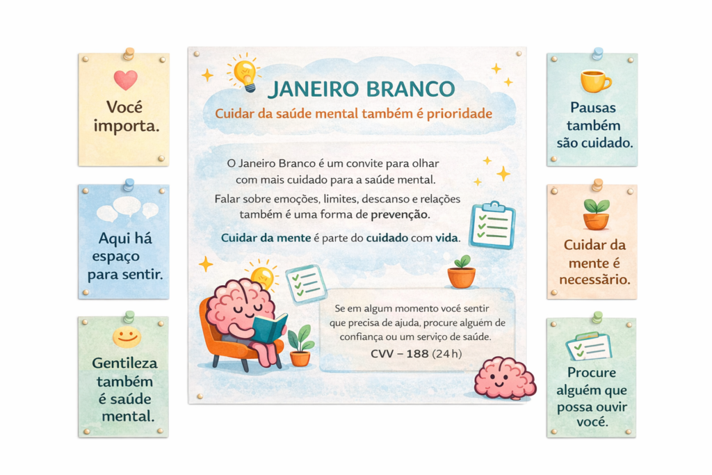 O Janeiro Branco na Prática é um kit de materiais educativos e visuais, criado para ajudar instituições e espaços coletivos a manter o tema da saúde mental presente durante todo o mês de janeiro — de forma leve, respeitosa e contínua.